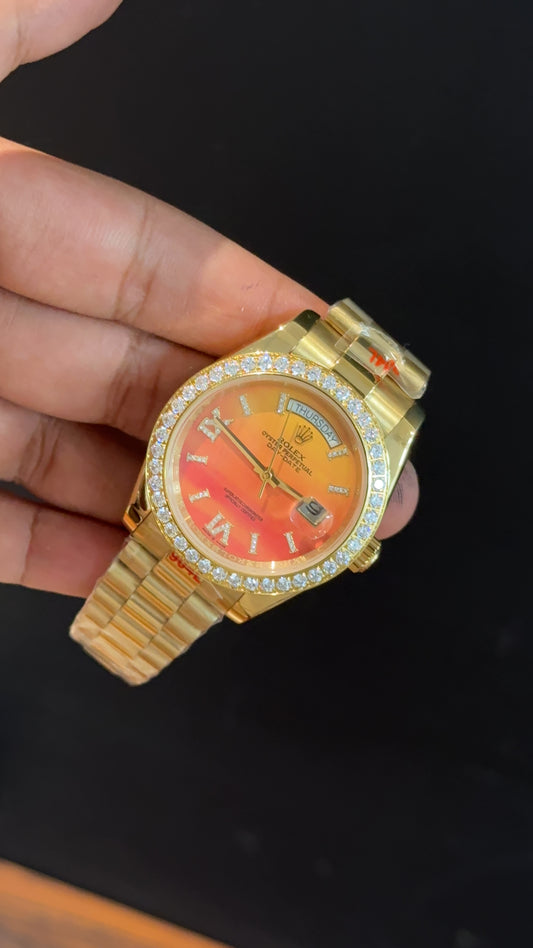 Daydate | Diamond Bezel | Gold Chain | Shady Orange Yellow Dial
