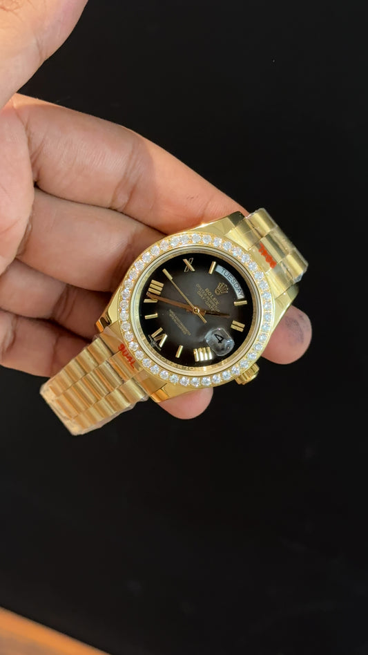 Daydate | Diamond Bezel | Gold Chain | Smokey Black Dial