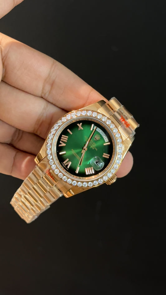 Daydate | Diamond Bezel | Rose Chain | Gradient Green Index Dial