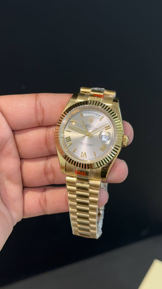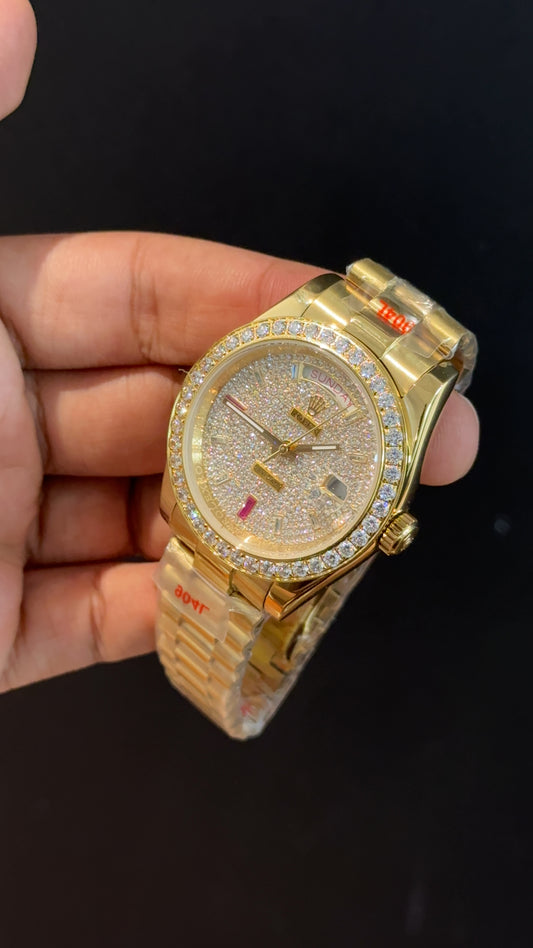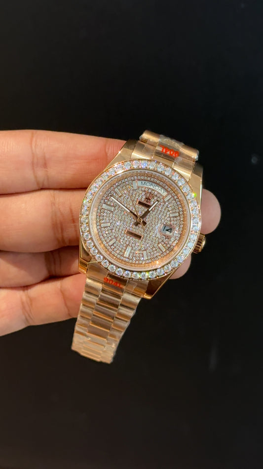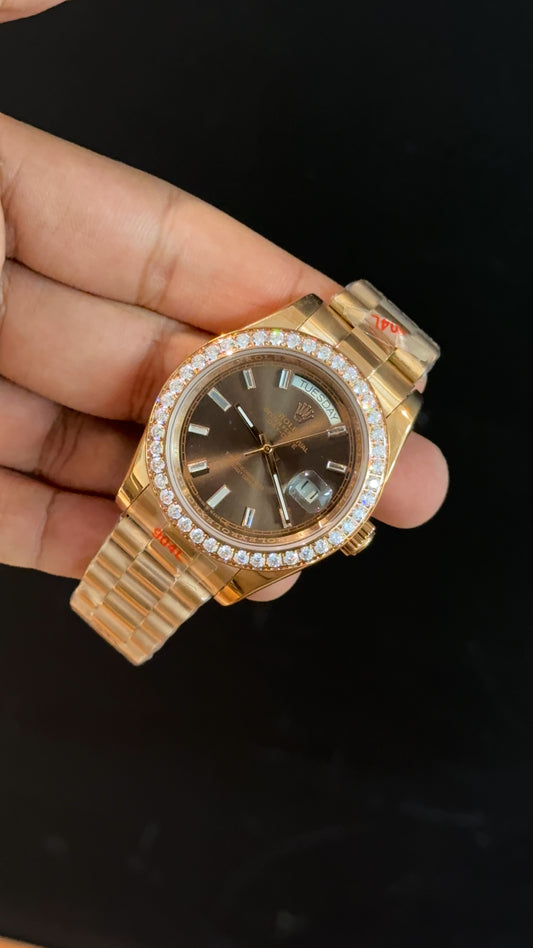 Daydate | Diamond Bezel | Rose Chain | Pearl Digit Brown Dial