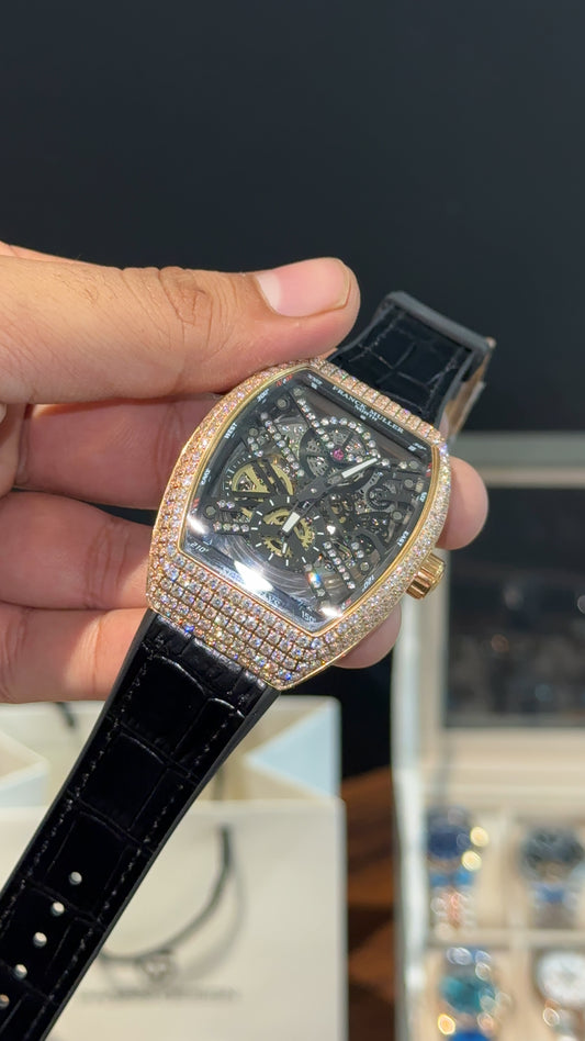 Premium Franck Muller | Curvex Skeleton | Rose Pearl Case | Black Leather Strap | Black Dial