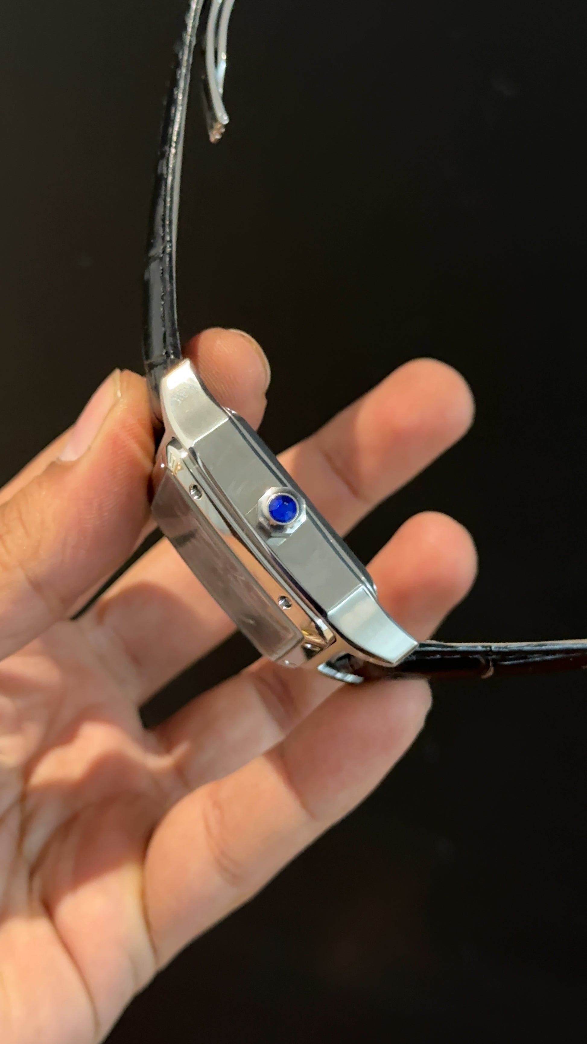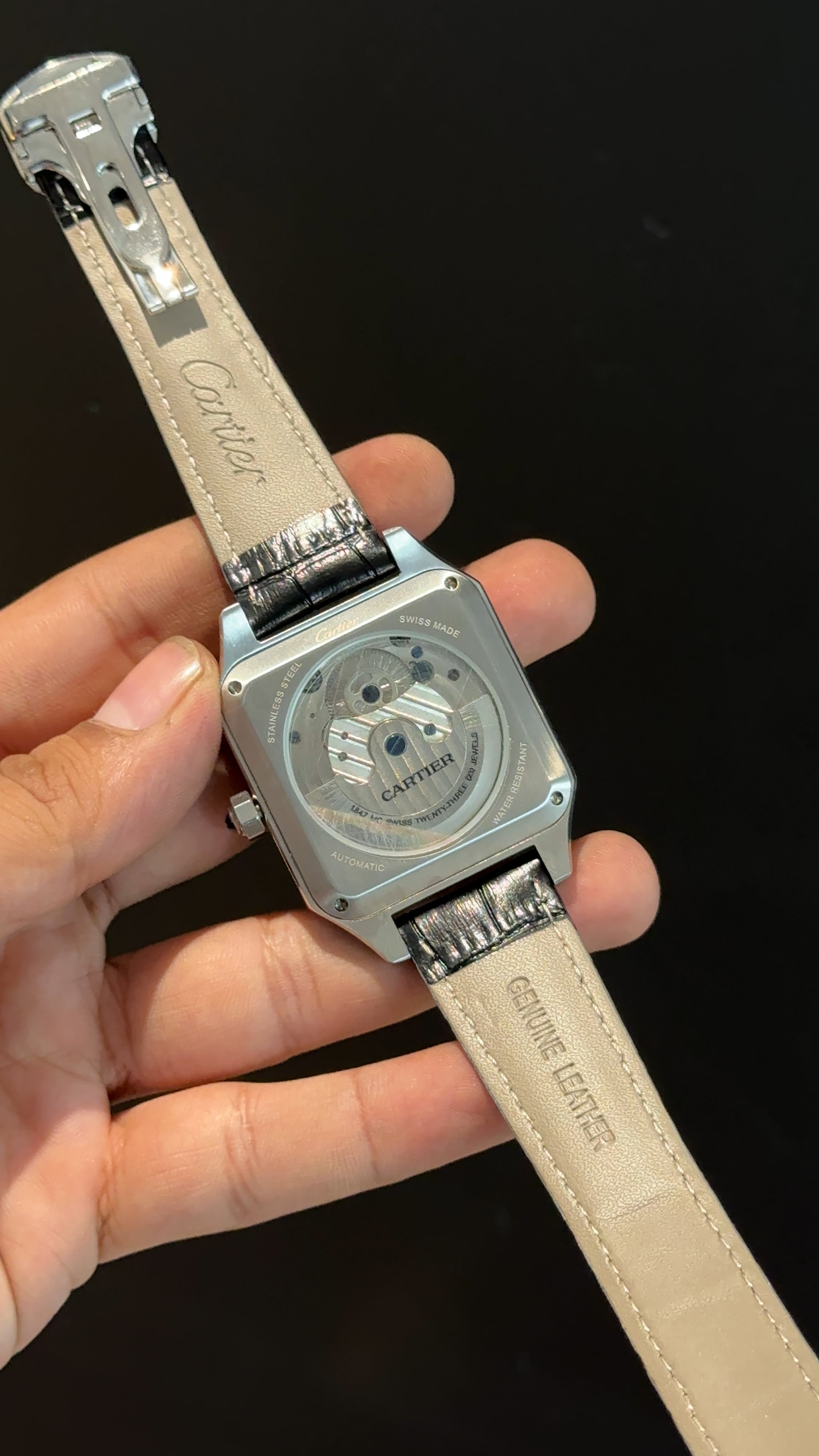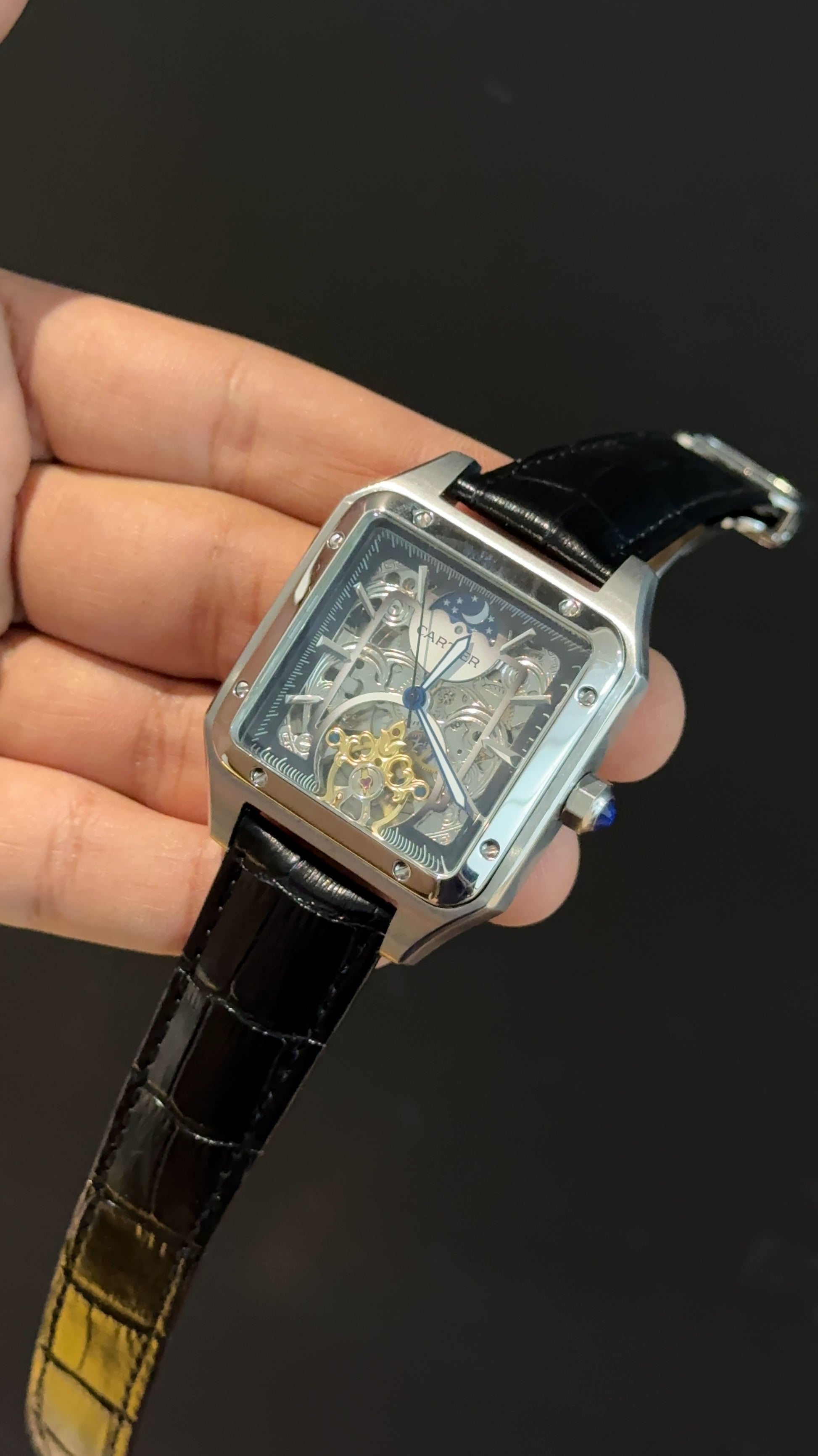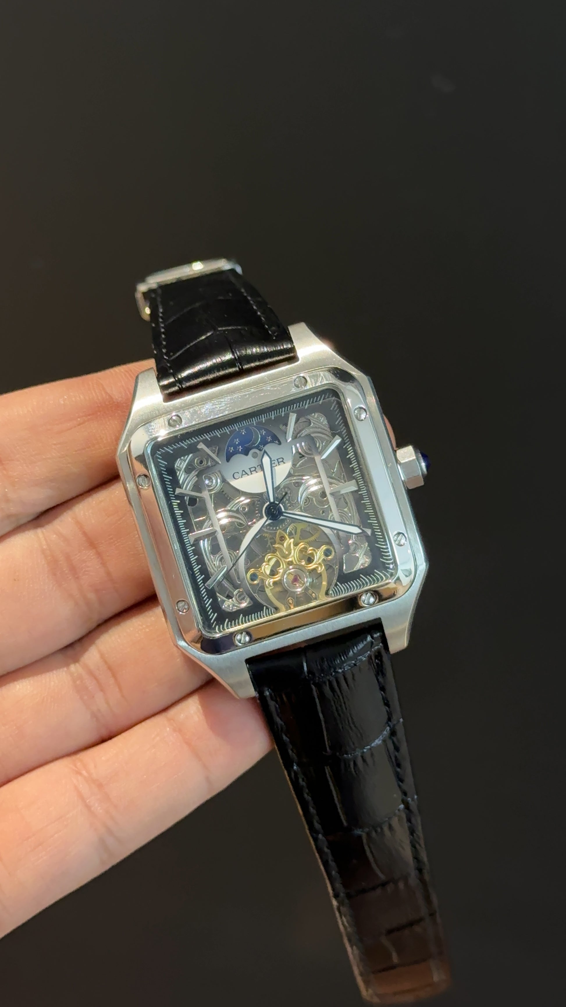 Cartier | Silver | Skeleton | Square Shape Case | Moonphase | Black Leather Strap | Grey Dial
