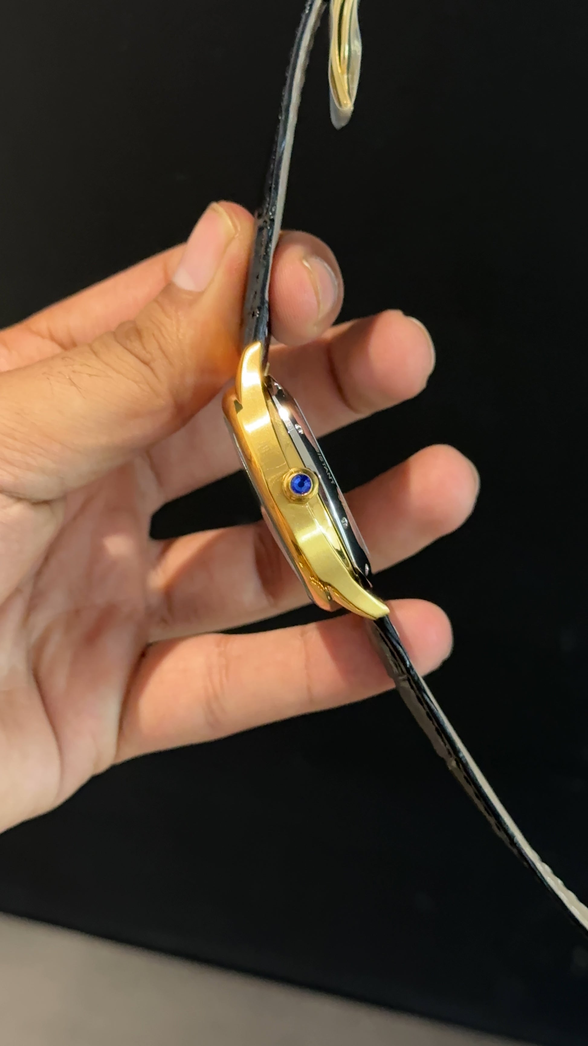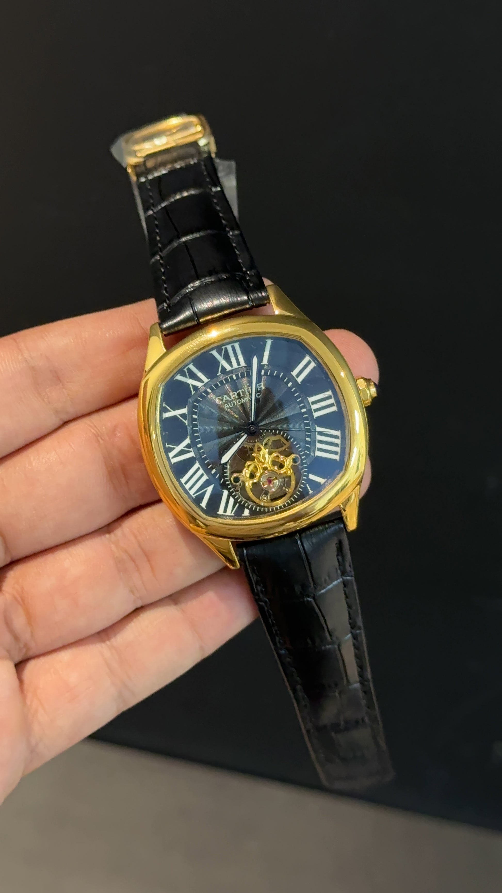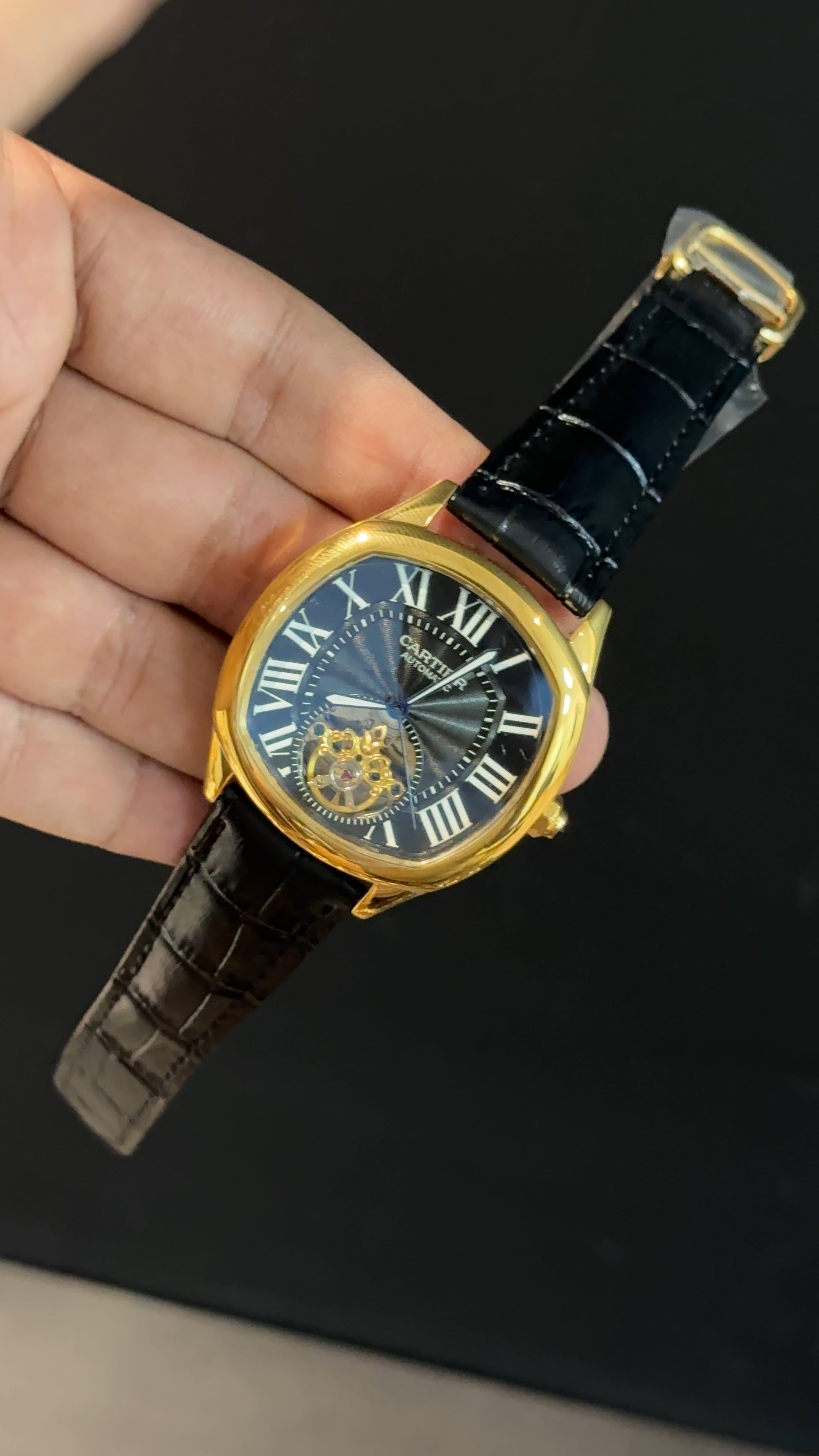 Cartier | Gold Square Bezel | Pendulum | Black Strap | Black Index Dial