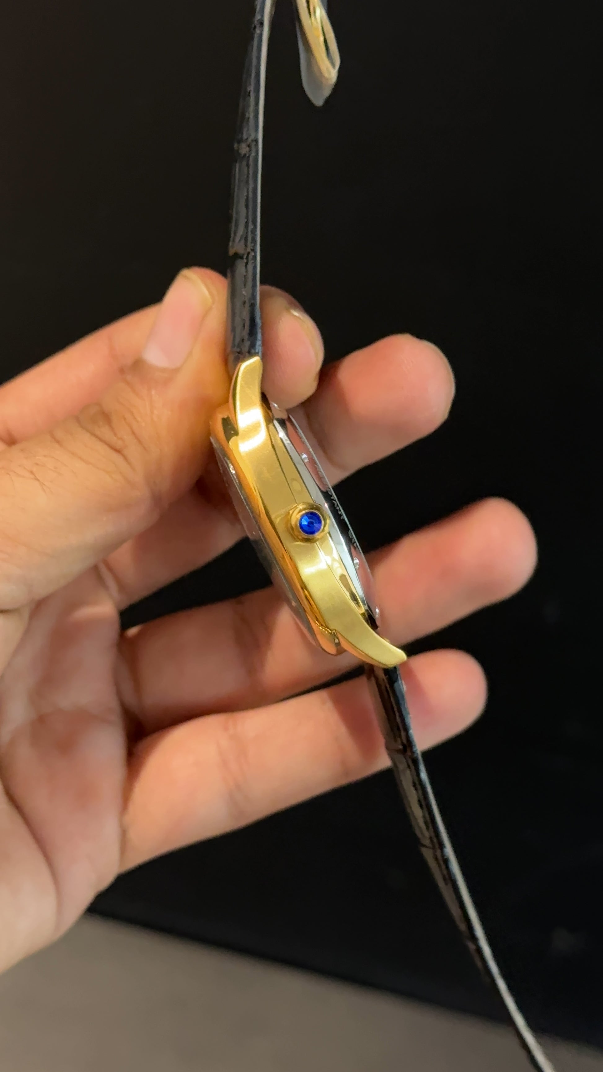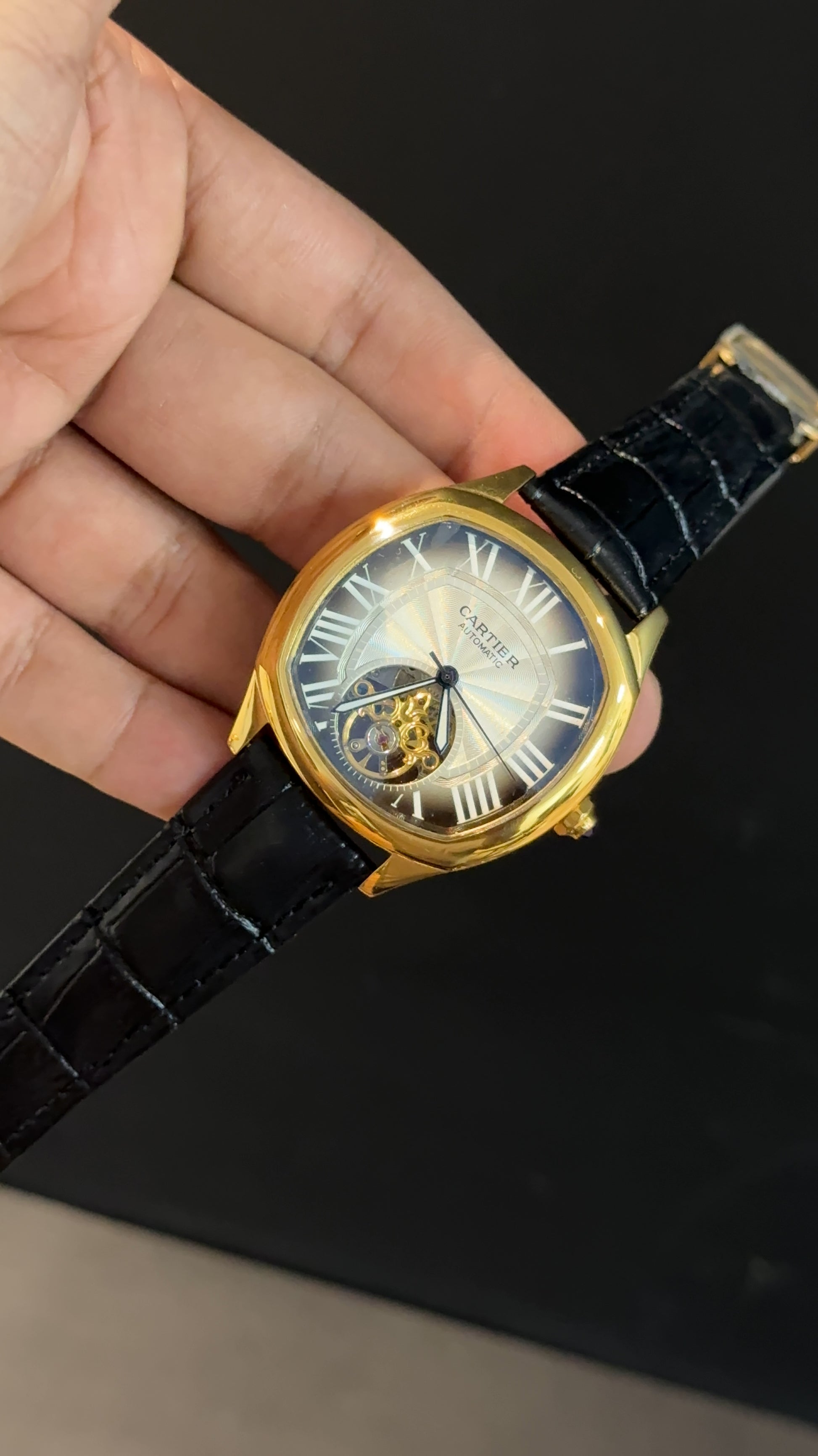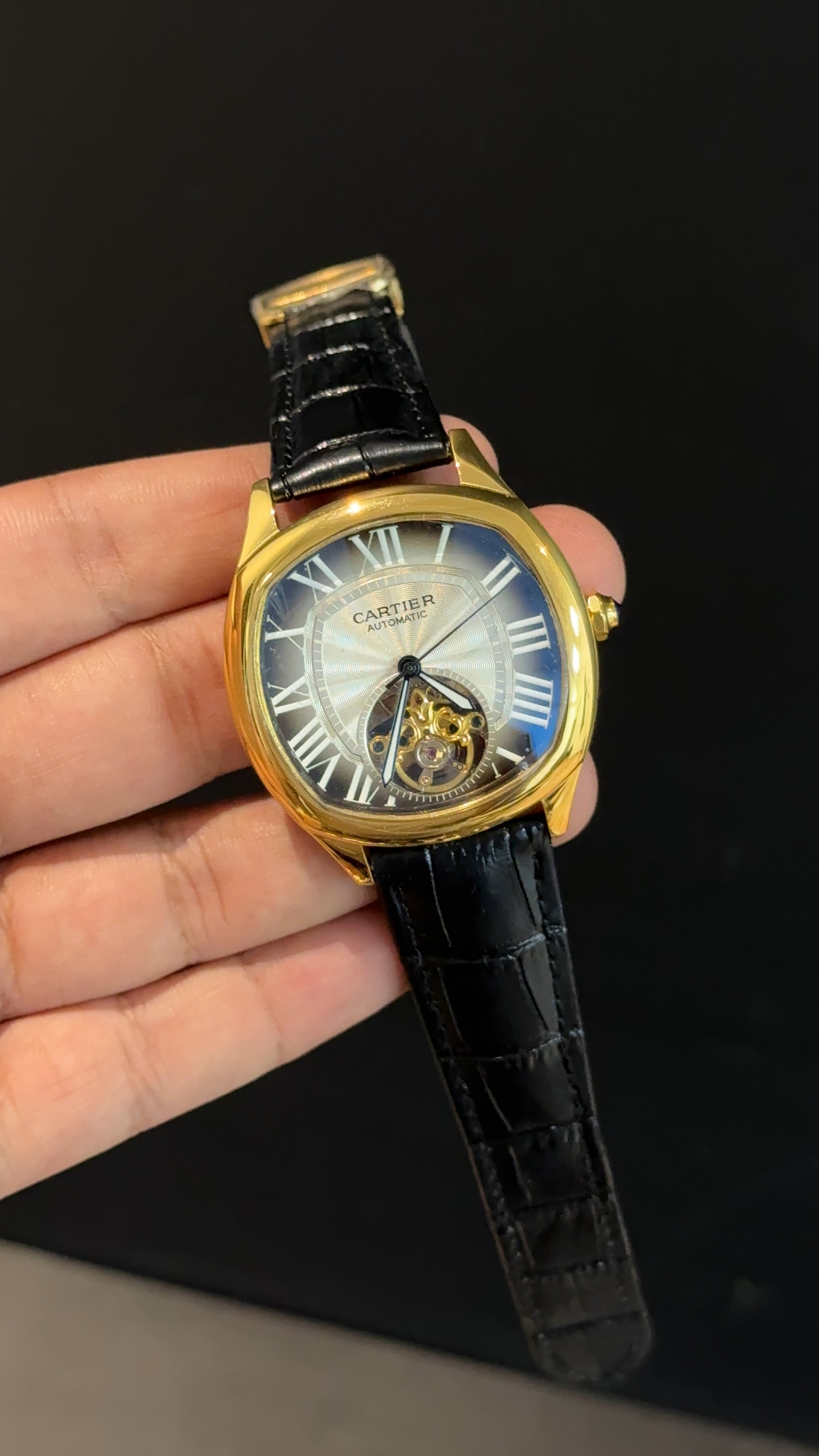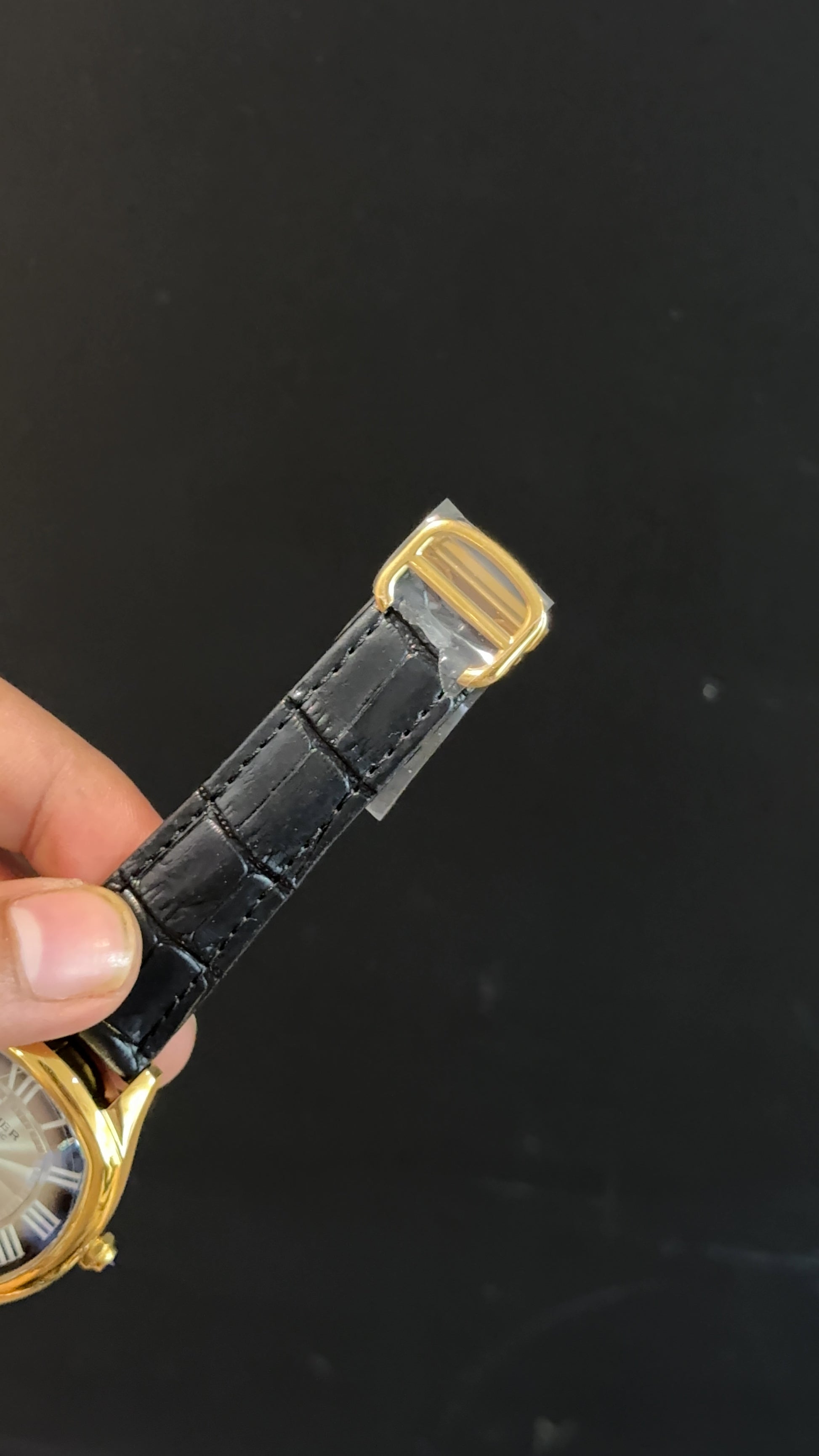 Cartier | Gold Square Bezel | Pendulum | Black Strap | Shady White Black Dial
