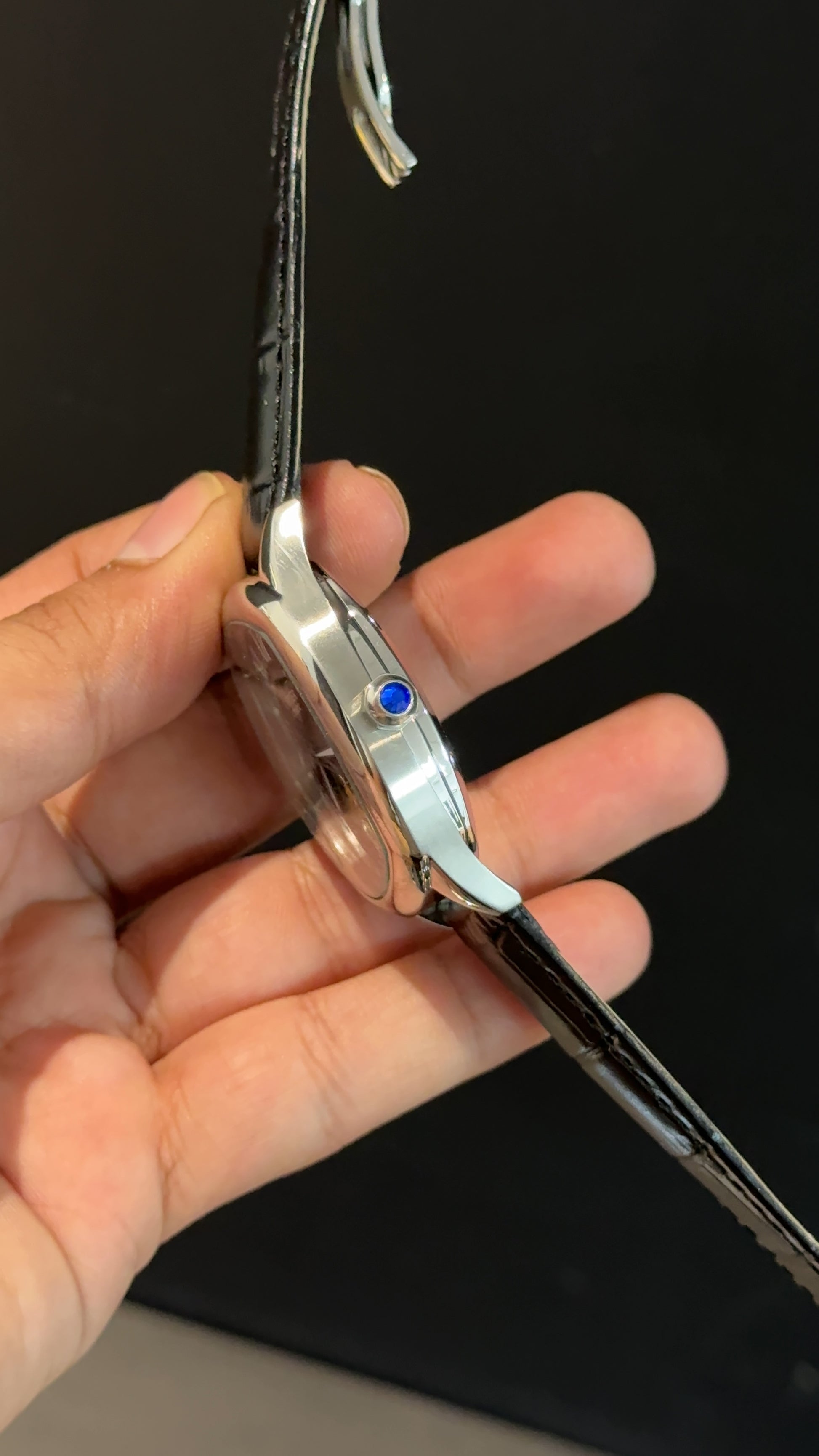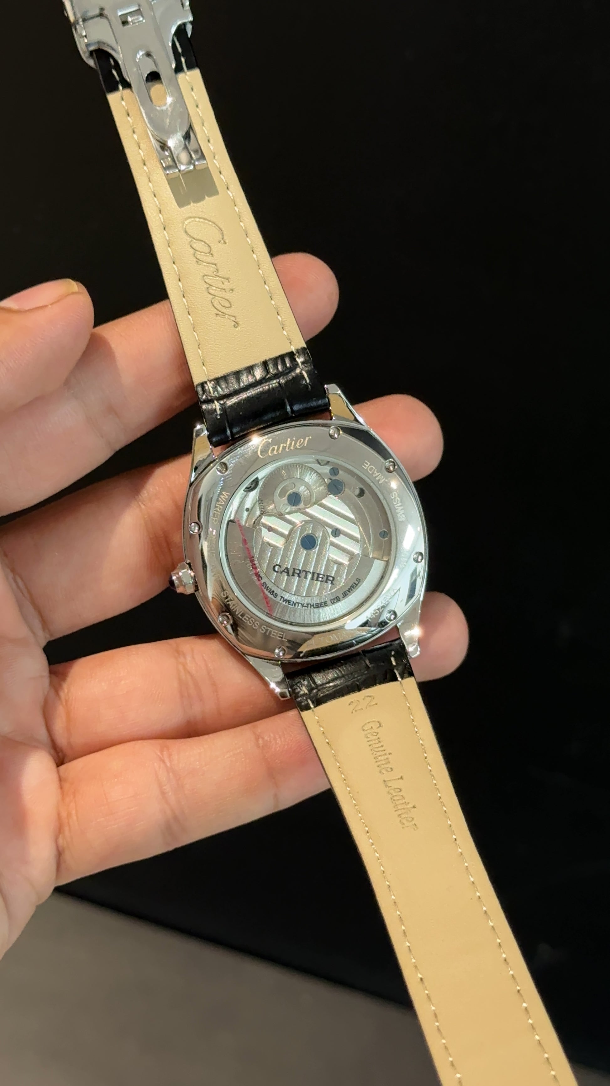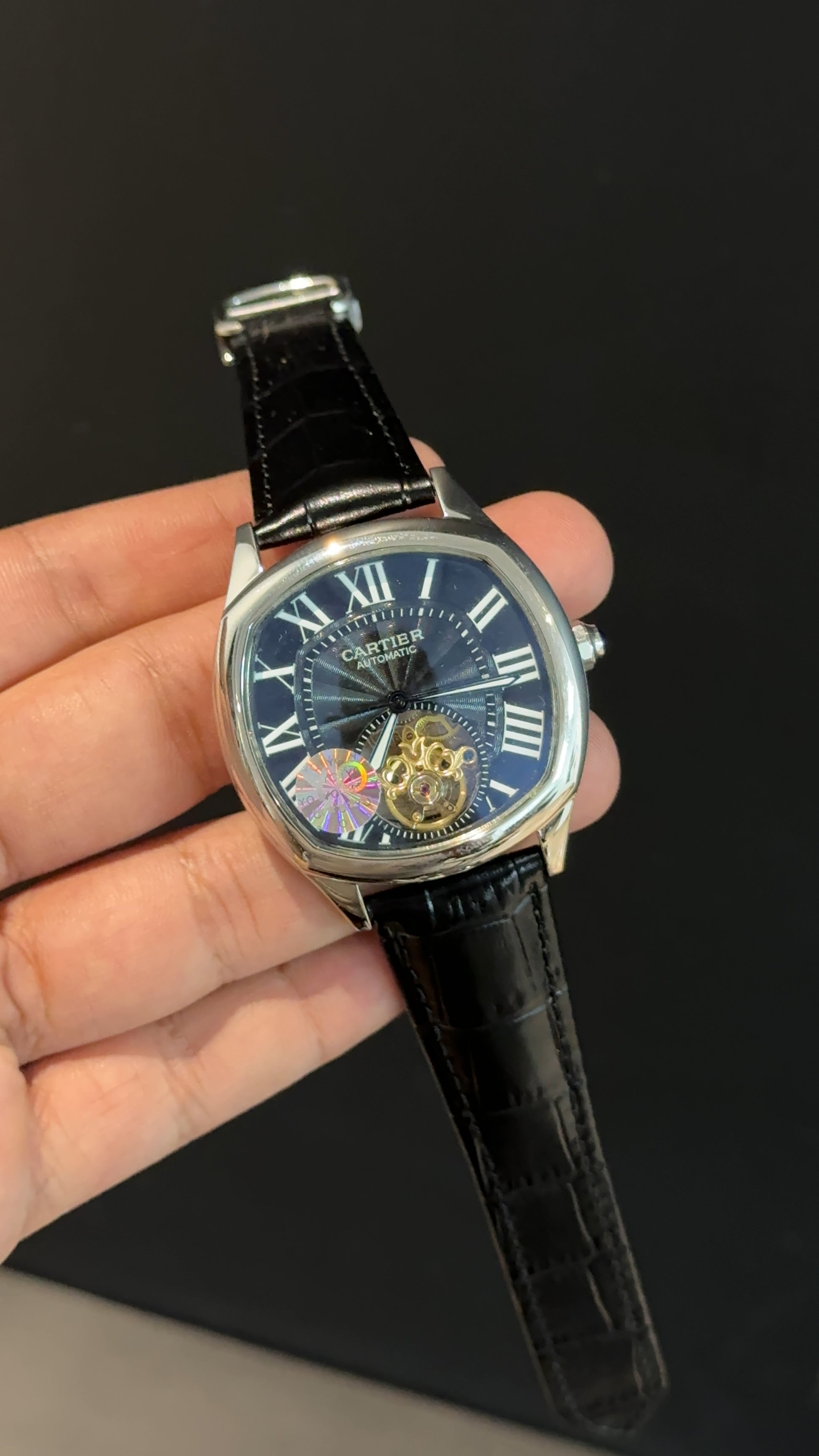 Cartier | Silver Square Bezel | Pendulum | Black Strap | Black Index Dial