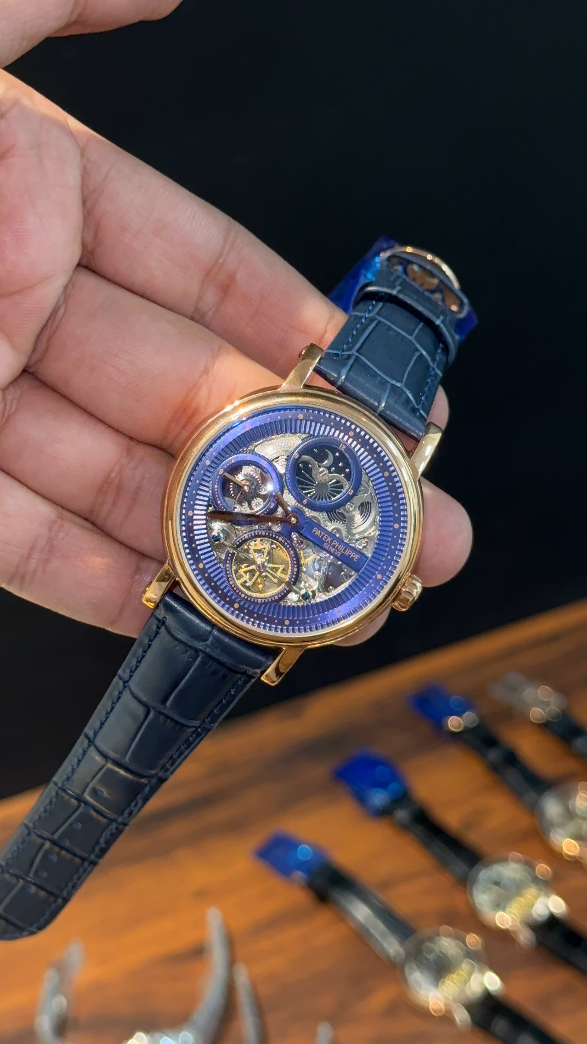Patek Rose | Moonphase | Pendulum | Second Timer| Blue Leather Strap | Grey Machine | Blue Dial