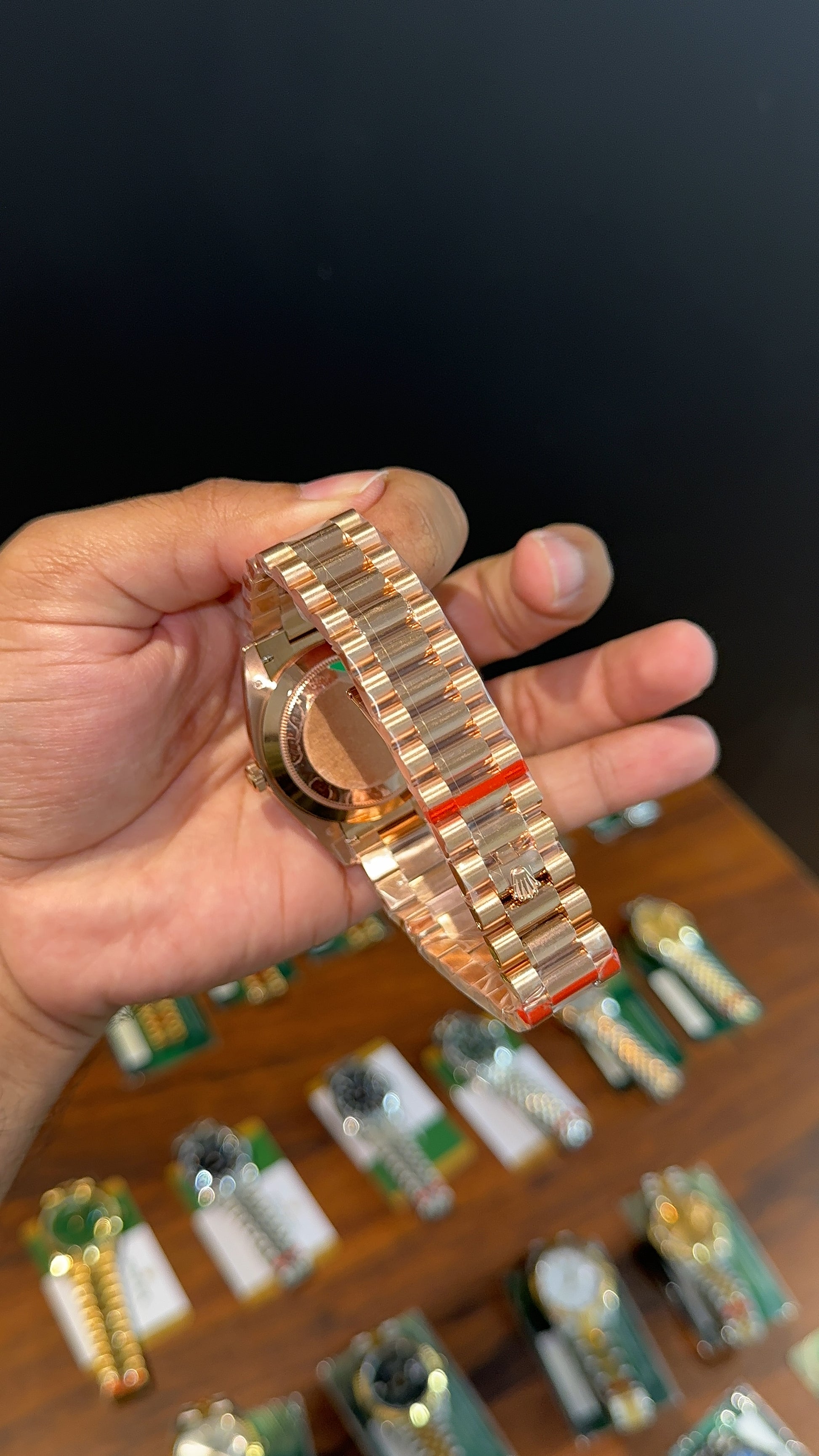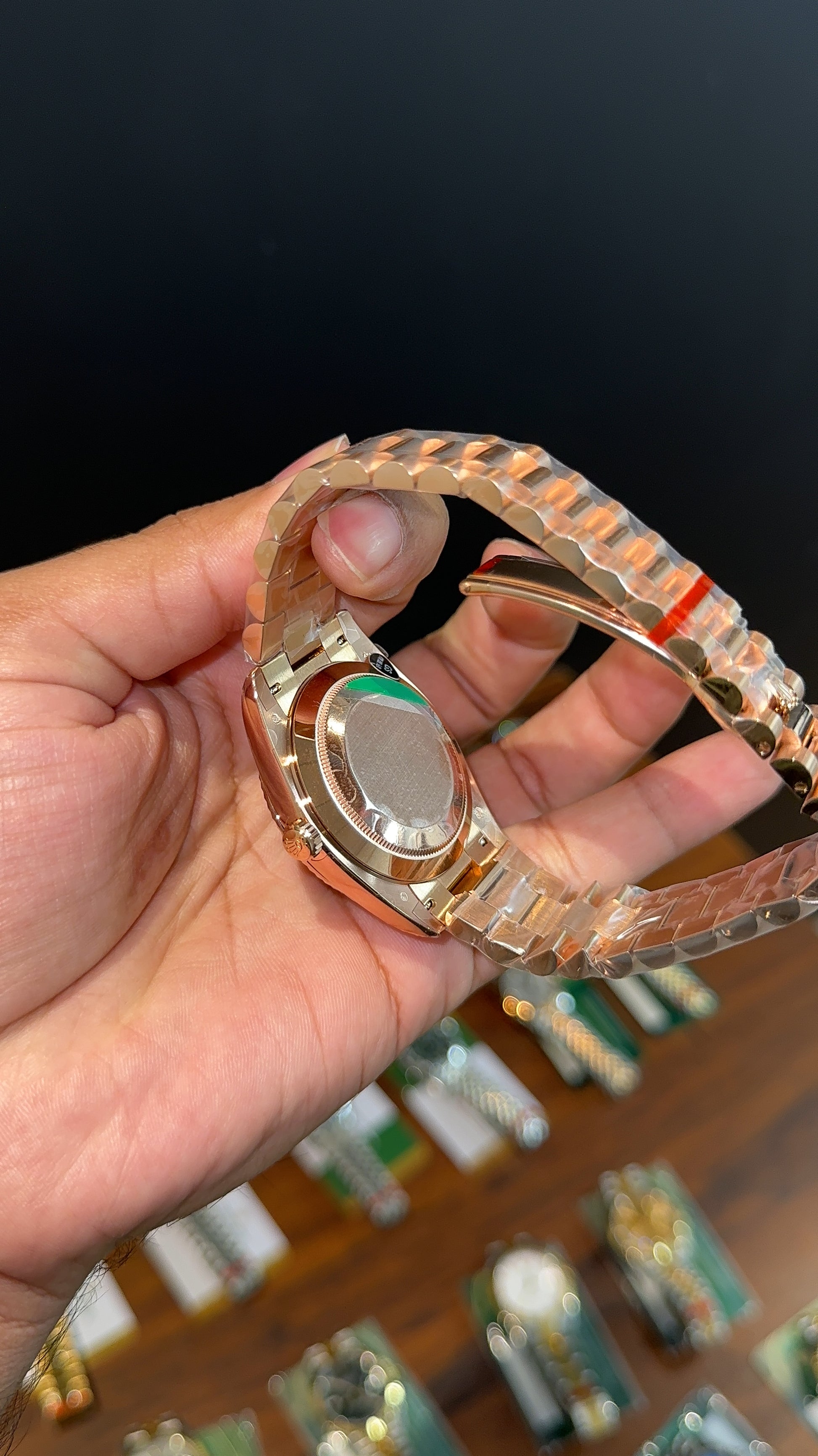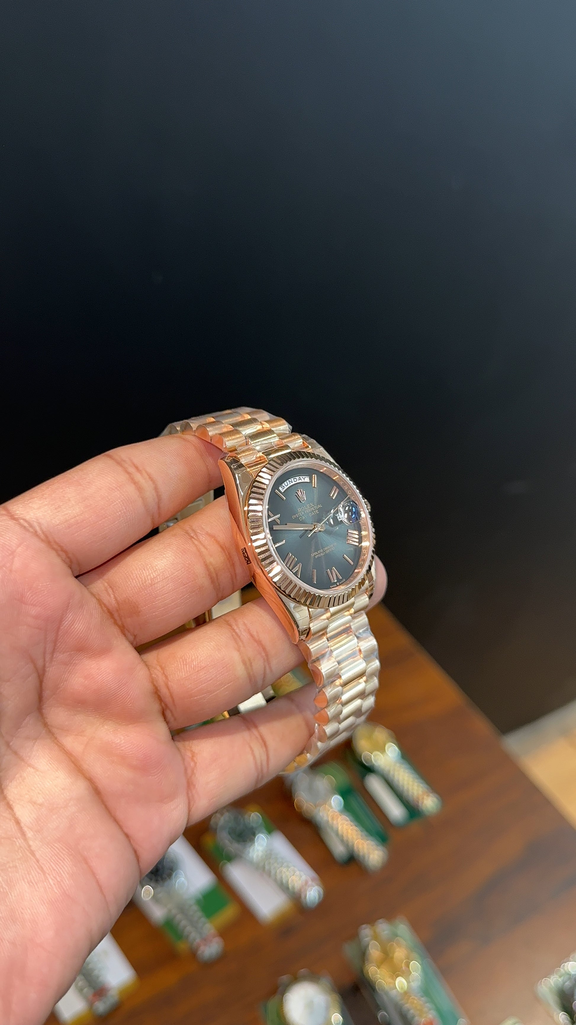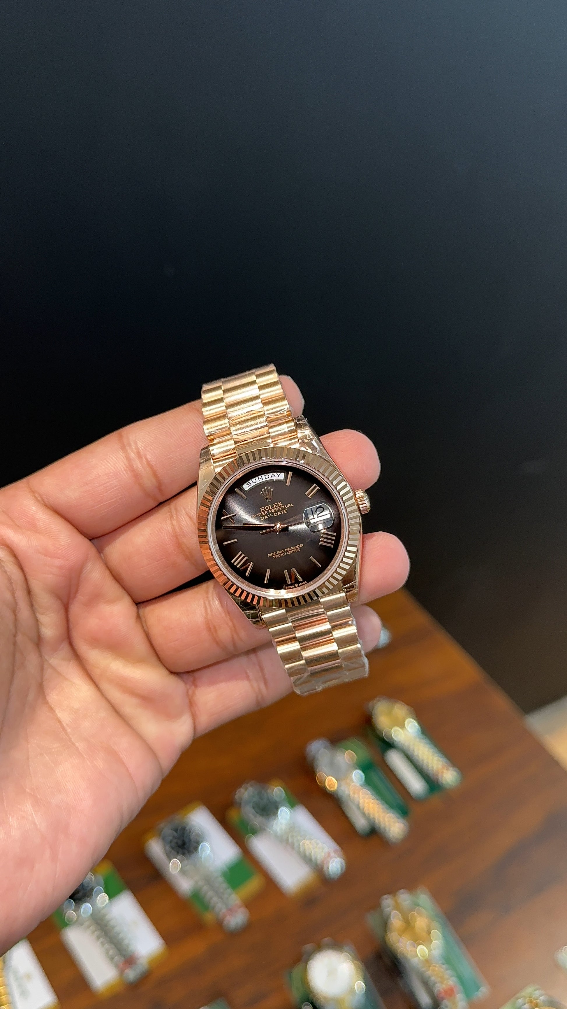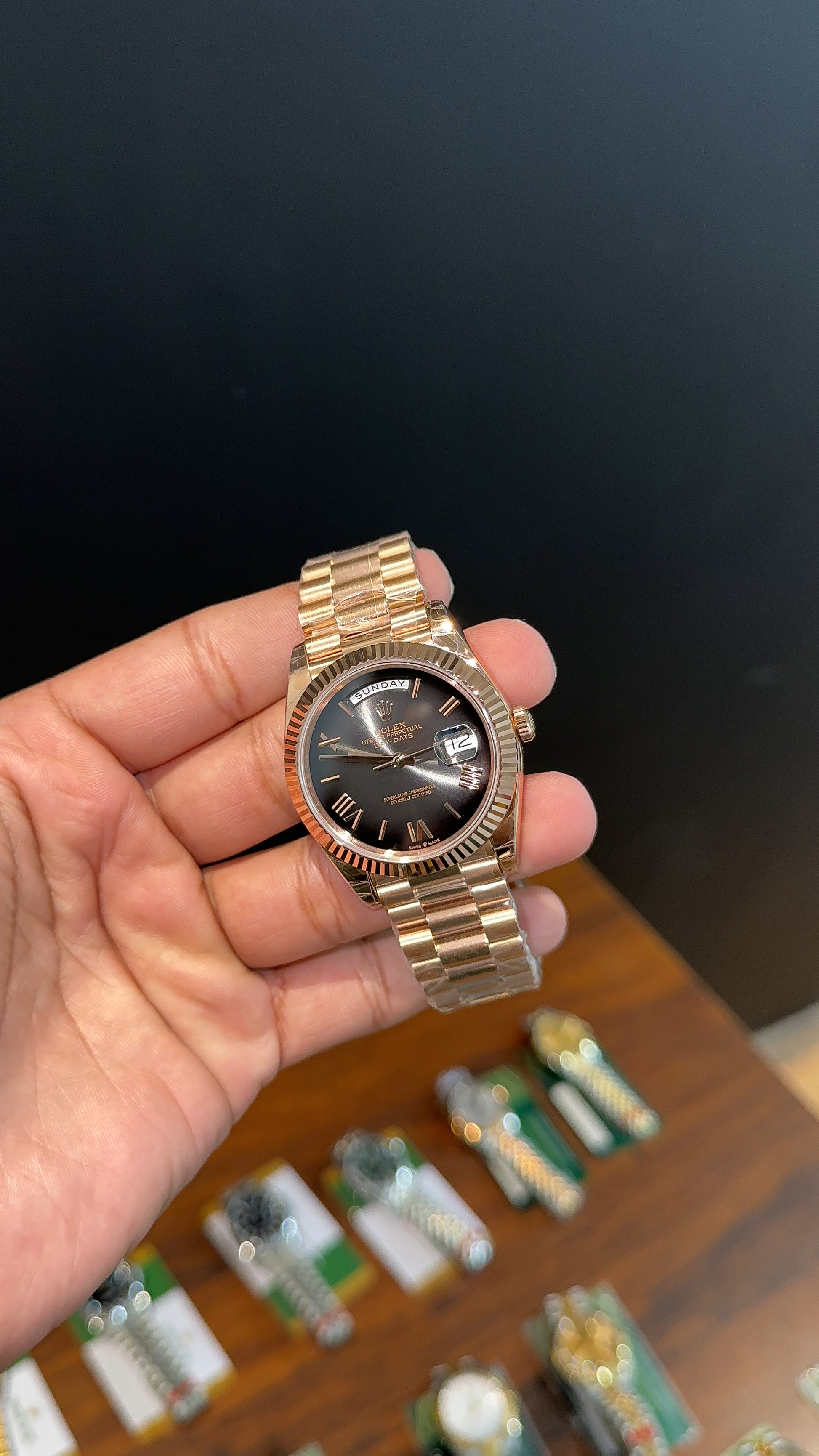 Premium Daydate | 40mm | Rose Chain | New Smoked Black Dial