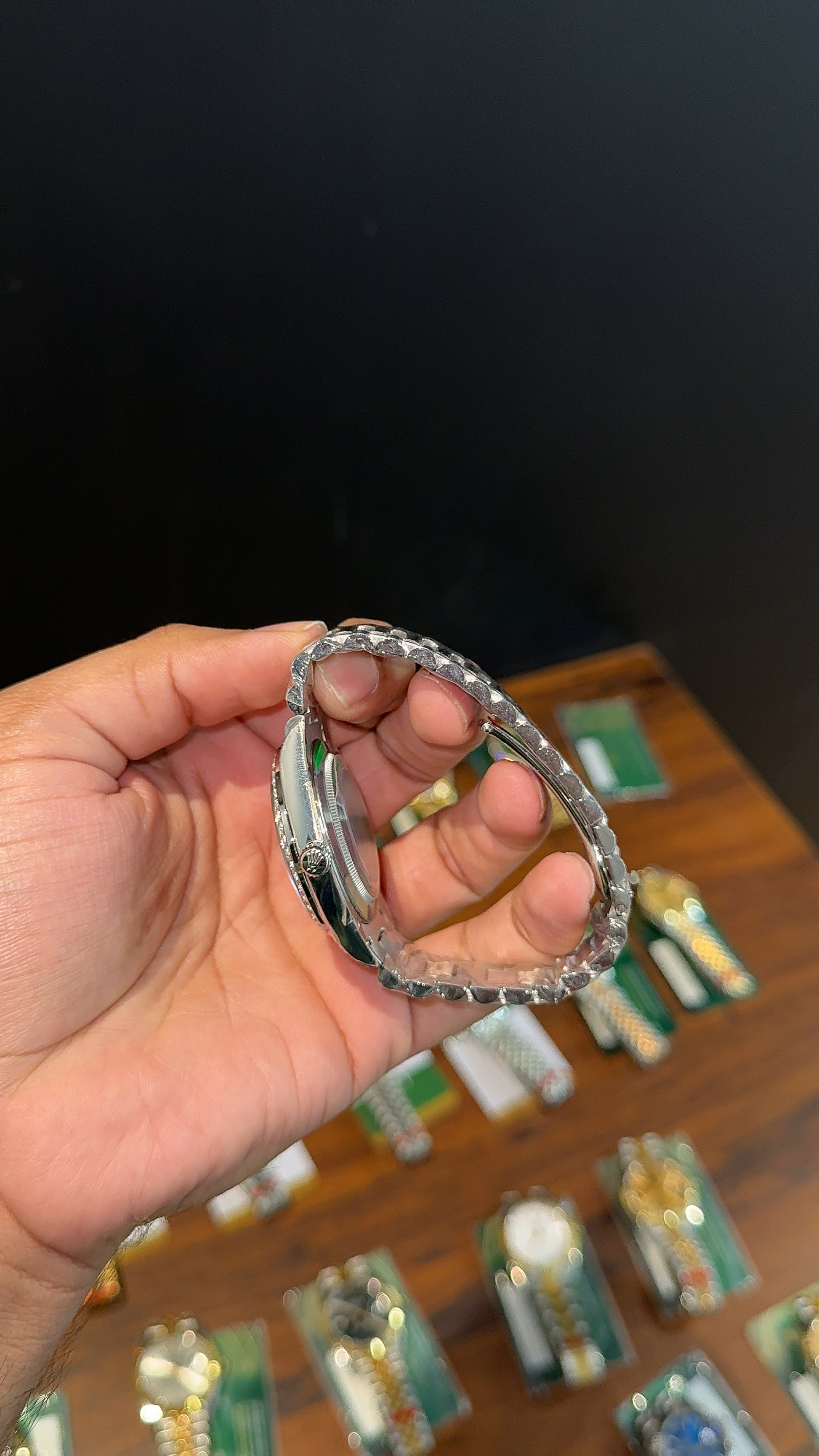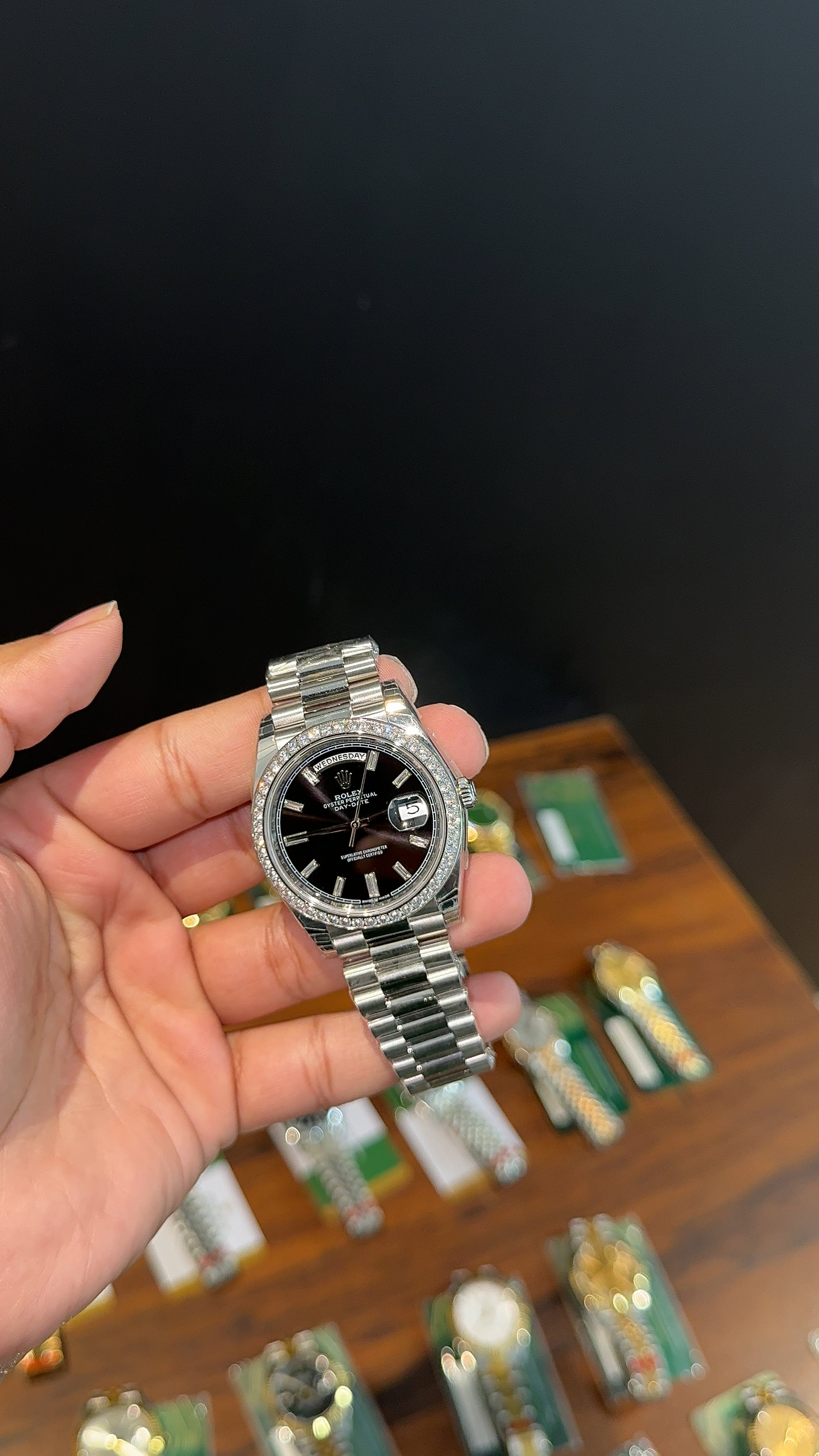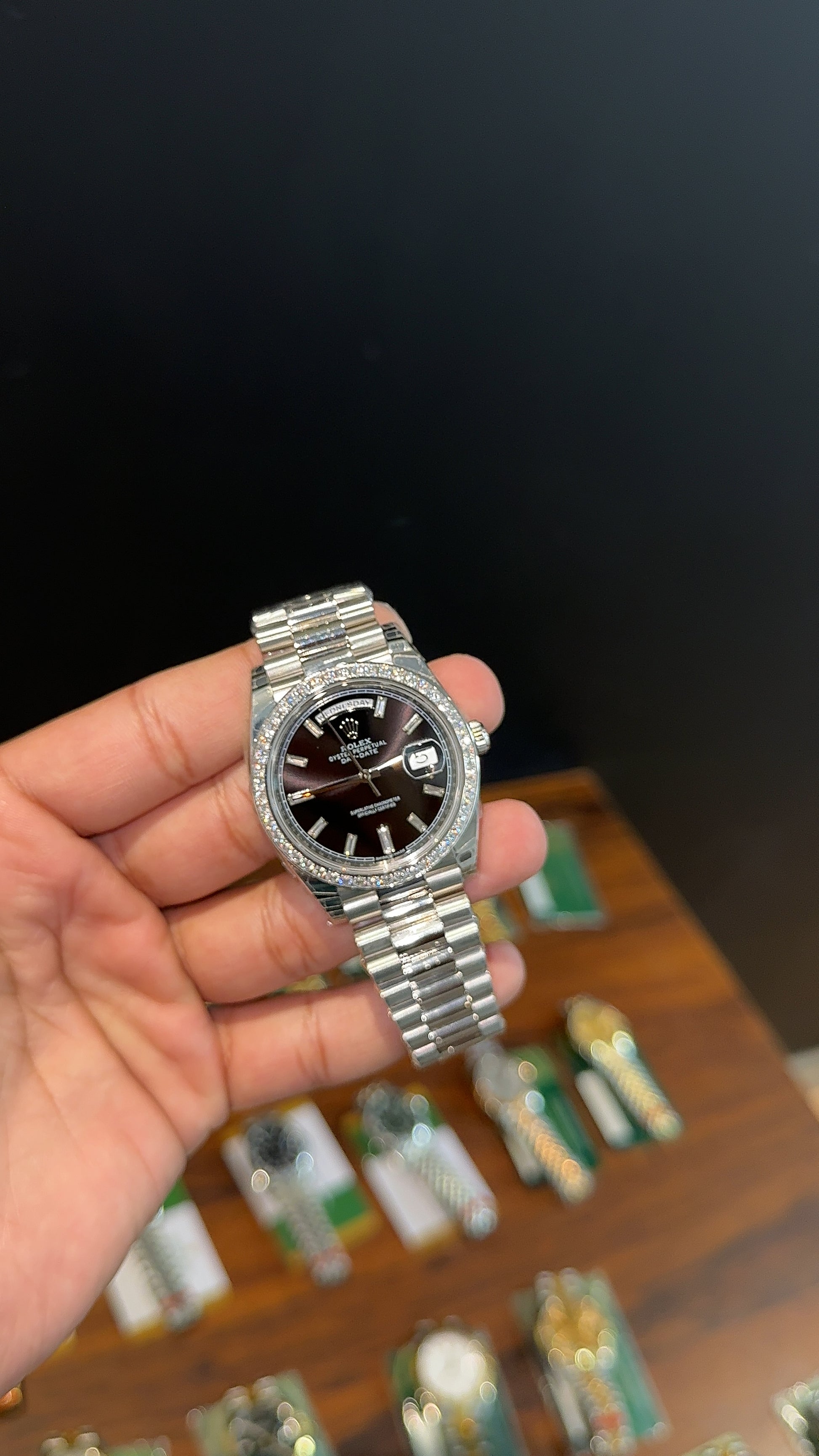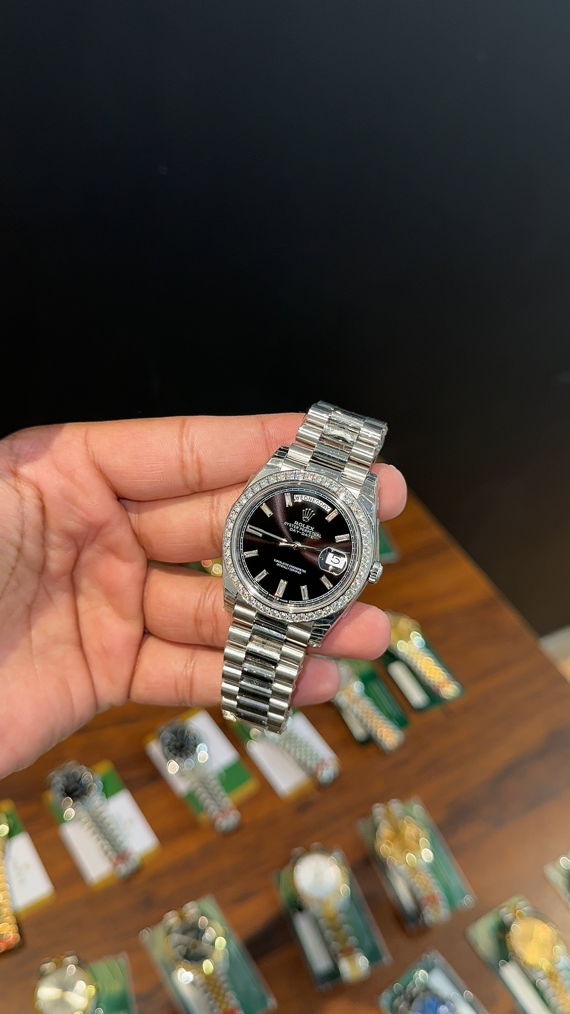 Premium Daydate | 40mm | Diamond Bezel | Silver Chain | Black Dial