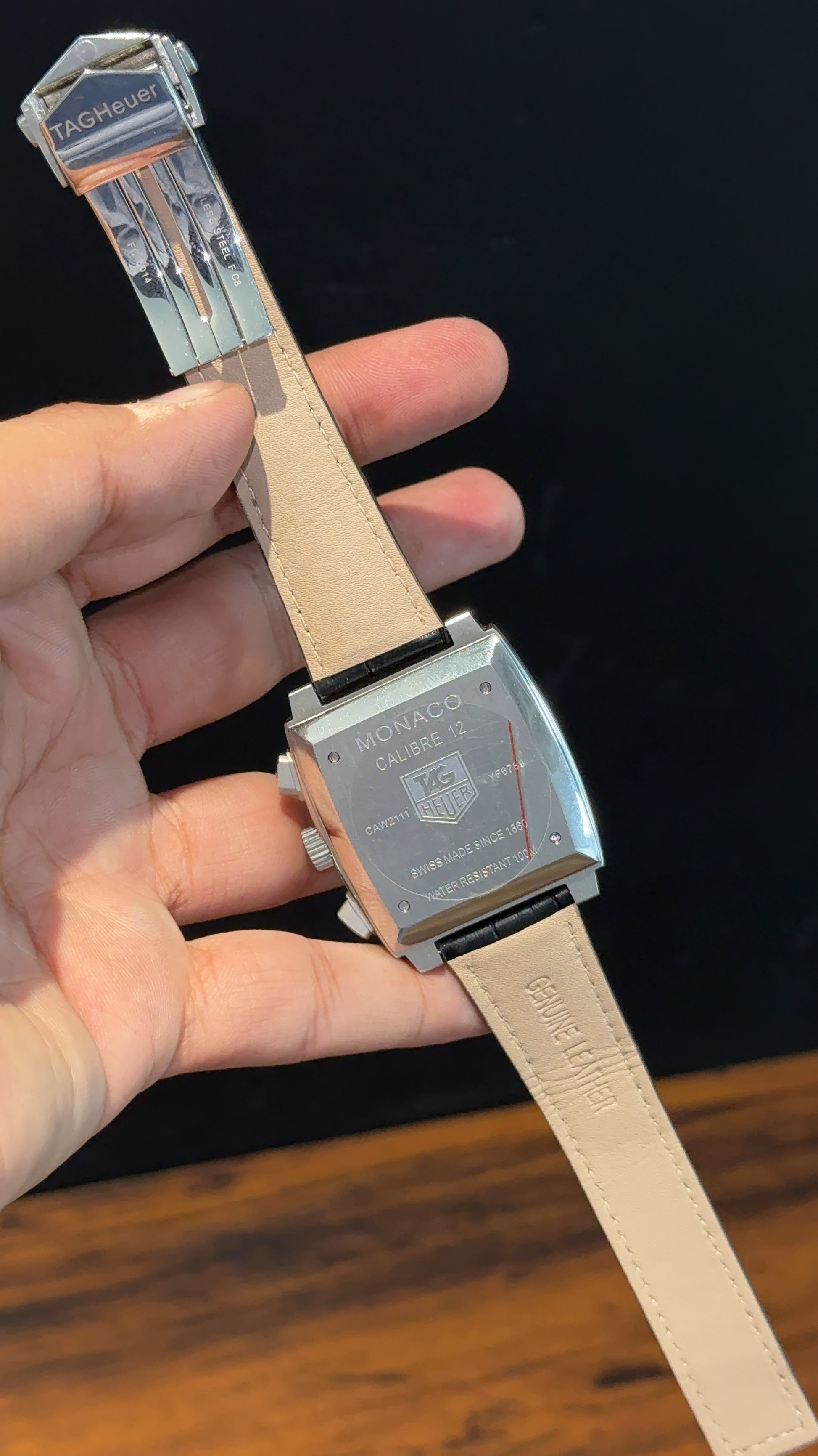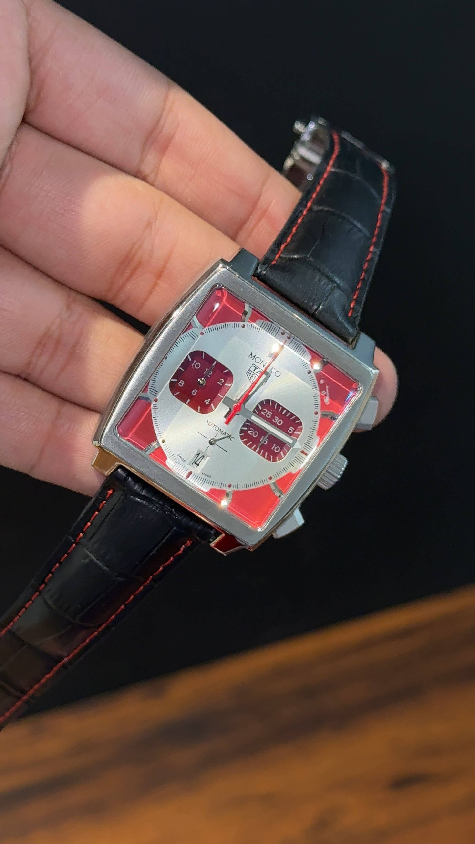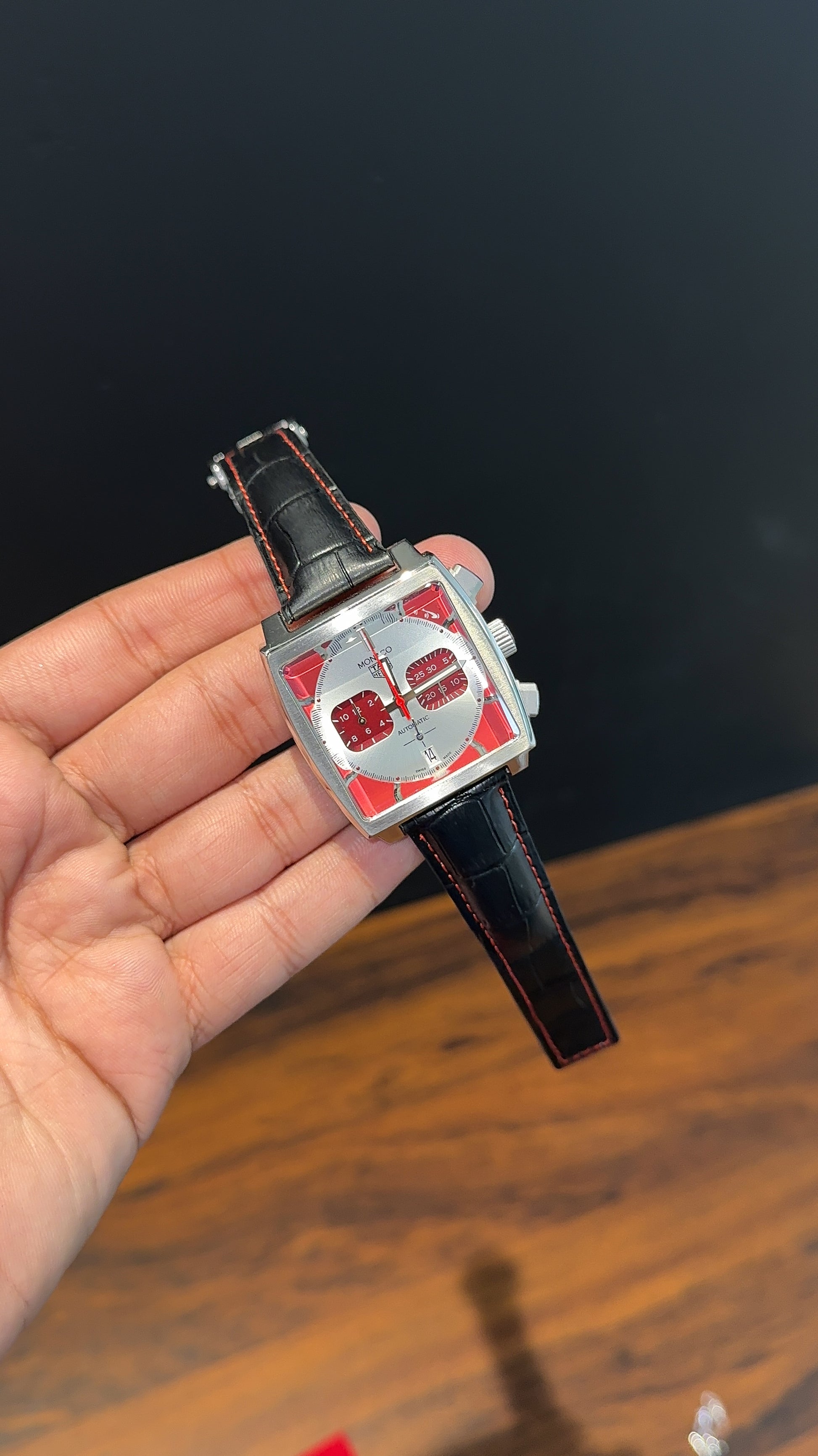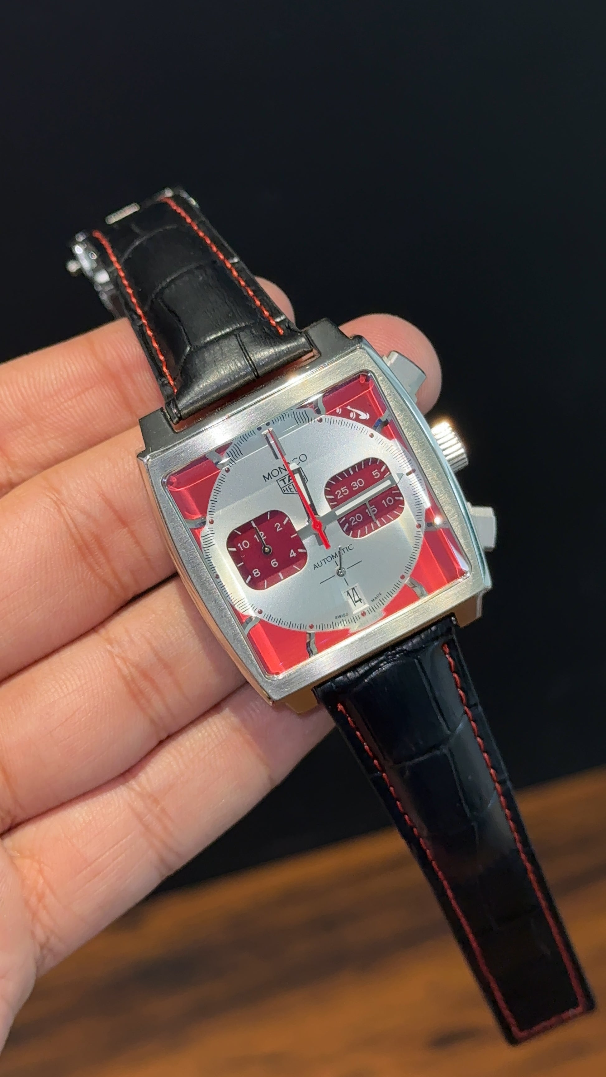 Tag Monaco | Black Leather Strap | Mehron Chrono | Red Silver Dial