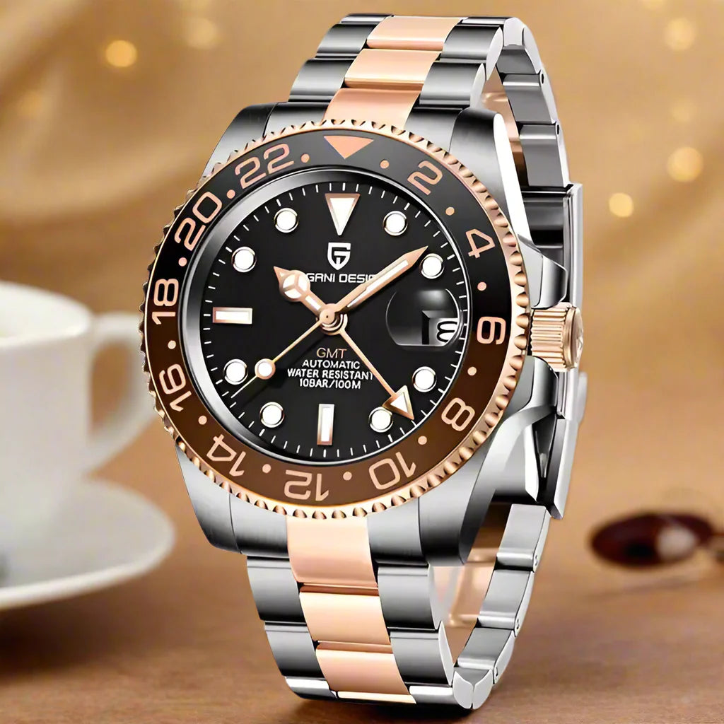 The Pagani Design PD-1662 GMT is a stylish and functional timepiece inspired by the legendary Rolex GMT-Master II. Designed for globetrotters and watch enthusiasts, this automatic dual-time watch combines sophisticated aesthetics, robust craftsmanship, and practicality, making it perfect for both travel and everyday wear.