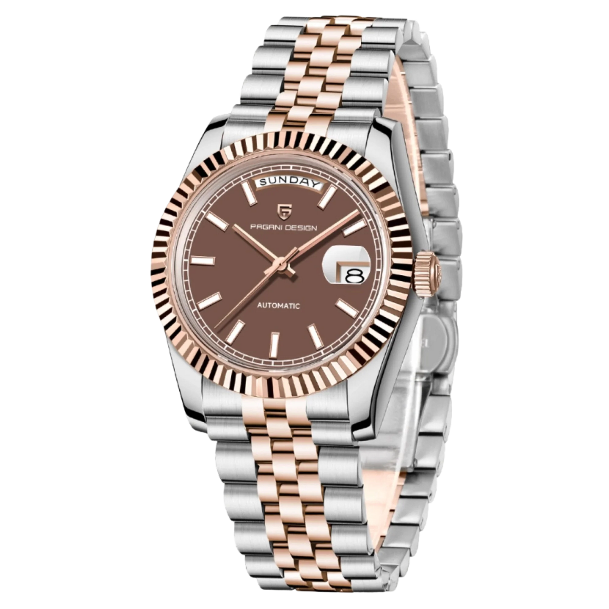 The Pagani Design PD-1752S SRGBN Day-Date is a stunning timepiece inspired by the iconic Rolex Day-Date, exuding luxury, sophistication. Designed for those who appreciate refined craftsmanship and premium aesthetics, this watch is a perfect companion for both formal and everyday wear.