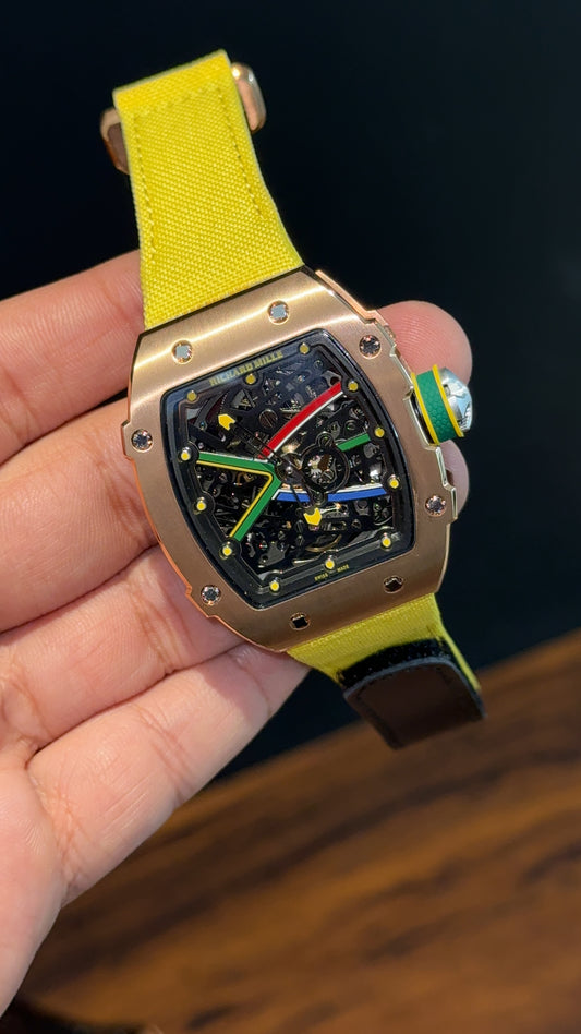 Premium Richard Mille | RM 67-02 Series | Rose Case | Skeleton | Yellow Strap | Black Dial